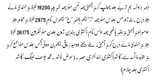 یمہ برونہہ یم تریہ جلد چھاپ کرنہ آمتۍ چھہِ تمن منز چھہِ الہ پلہ 19200 لفظ تہ تہندۍ معنی بیترِ درج۔ یتھ ژورمس جلدس منز چھہِ "ڑ” اچھرہ پیٹھہ "غ” اچھرس تام 2975 لفظ تہ محاورہ بیترِ سۅمبراونہ آمتۍ تہ یتھہ پاٹھۍ چھہِ ونس تام ڈکشنری ہندین ژۅن جلدن منز تقریبا 26175 لفظ بیترِ تہ تہندۍ معنی درج کرنہ آمتۍ۔ میہ چھیہ وۅمید زِ باقی اچھر یِن وۅنۍ اکس جلدس منزجمع کرنہ تہ شاید ما آسہِ سے کاشرِڈکشنری ہند ٲخری حصہ۔